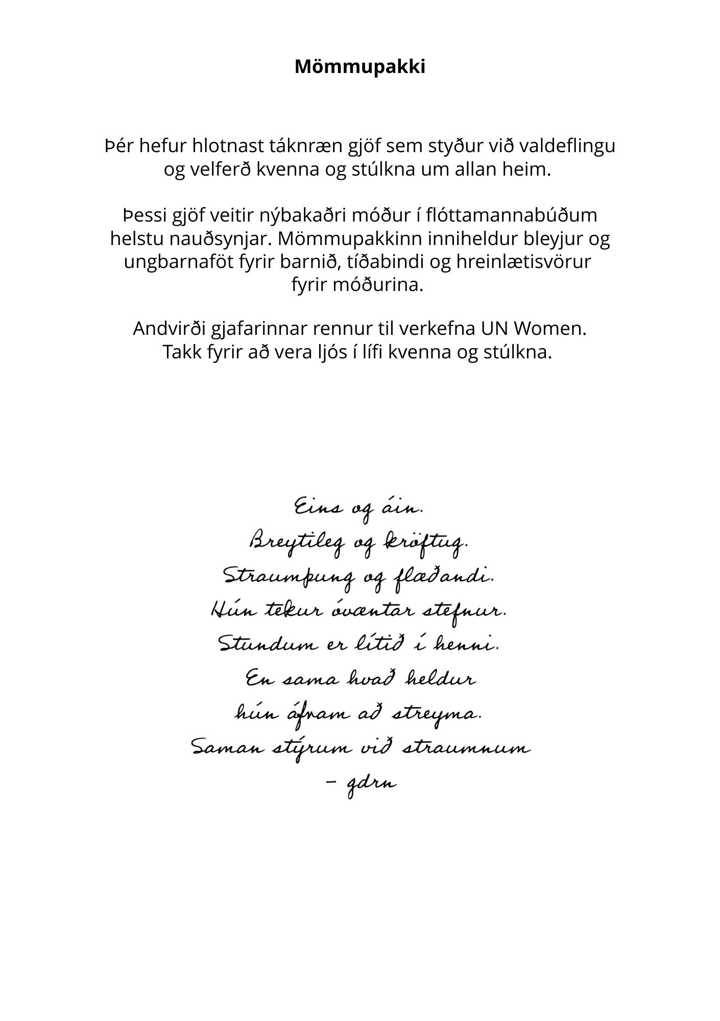 Mömmupakkinn inniheldur meðal annars bleyjur og ungbarnaföt fyrir barnið, tíðabindi og hreinlætisvörur fyrir móðurina.